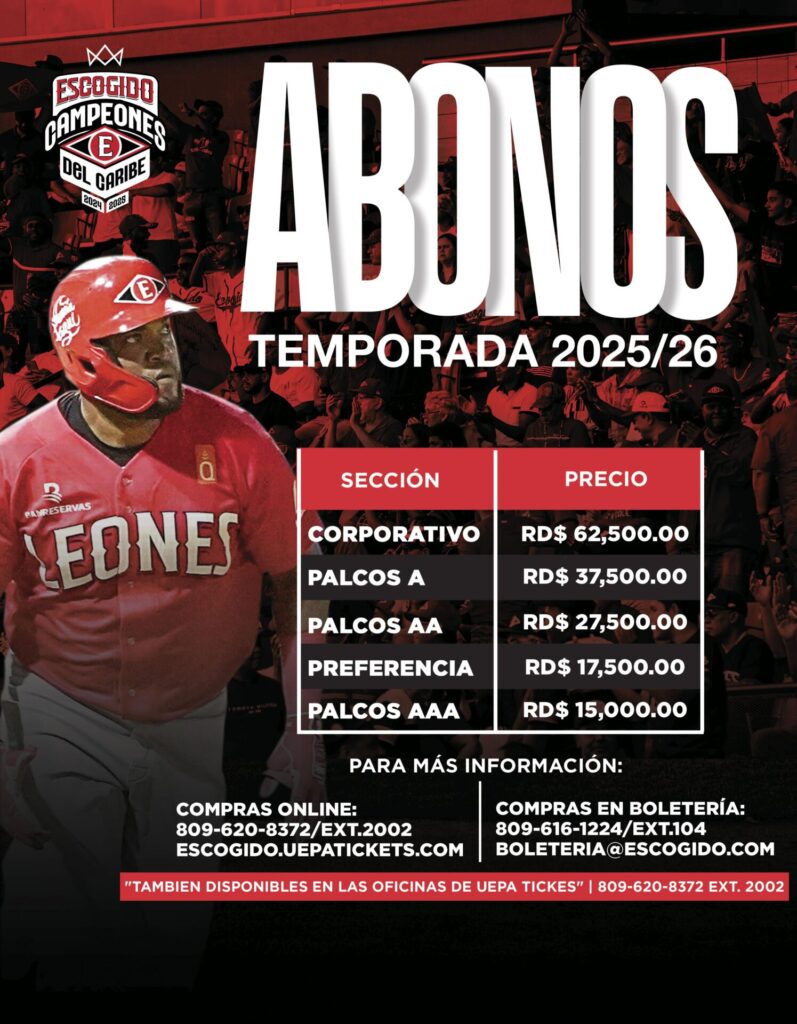 SANTO DOMINGO.- Los campeones nacionales y del Caribe, Leones del Escogido, iniciaron este martes la venta y renovación de sus abonos para la temporada 2025-26 de la LIDOM, con planes de pagos flexibles para los fanáticos escarlatas.
